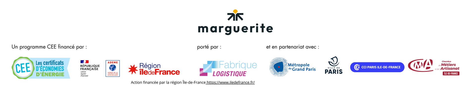 Le Programme Marguerite est porté par La Fabrique de la Logistique en partenariat avec la CCI Paris, la CMA Île-de-France, la Ville de Paris, la Métropole du Grand Paris et avec le soutien financier de la Région Île-de-France. Son ambition est d’accompagner les artisans et commerçants du territoire dans l’expérimentation de solutions alternatives à l’usage de leur véhicule professionnel.